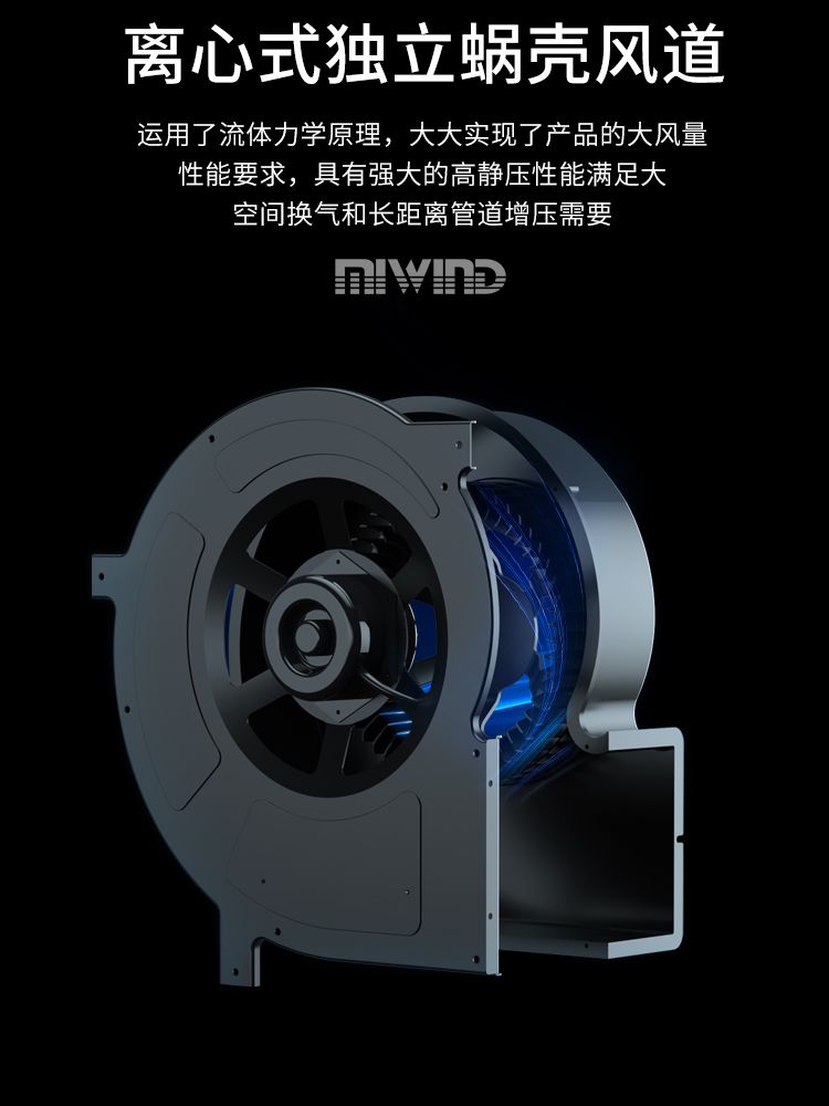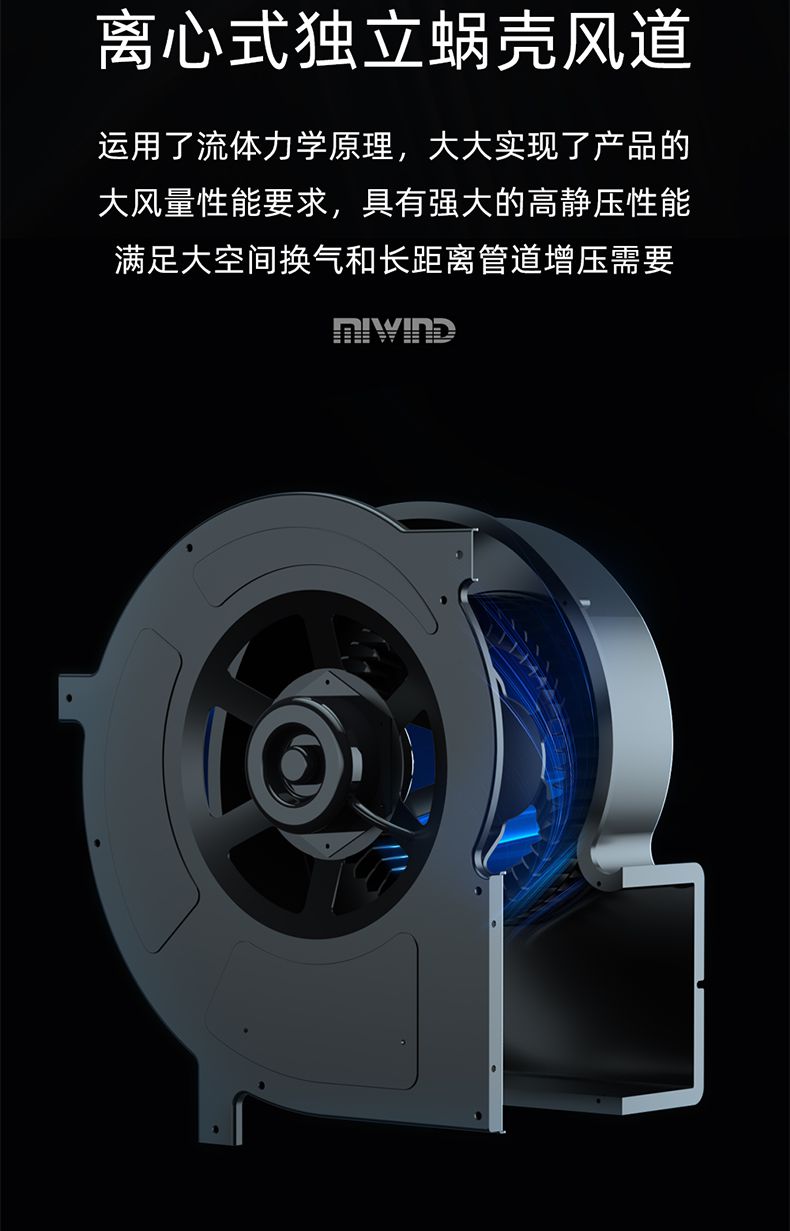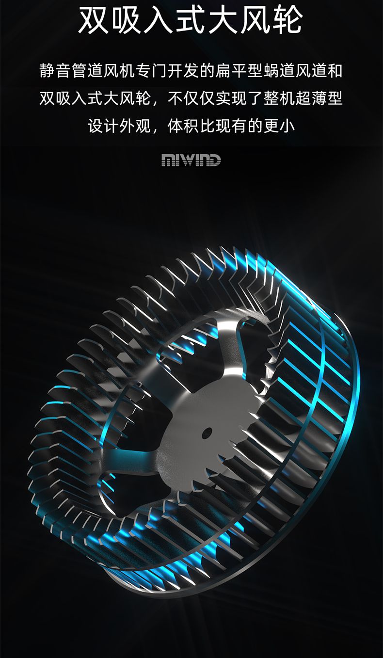 3、静音管道风机专门开发的扁平型蜗壳风道和双吸入式大风轮,不仅仅实现了整机的超薄型设计外观,体积比现有产品更小,施工更加简易,