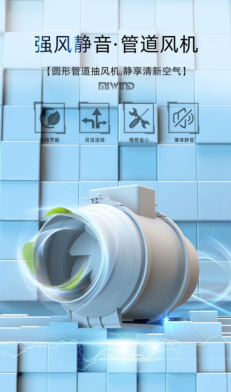 2、以小的电机功率输送大的风力,这是普通离心风机所不能达到的效果,因此管道风机既节能又大风,转速稳定,使用寿命持久。