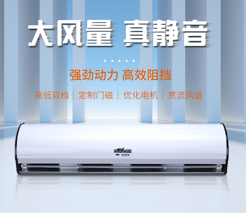 1、离心式风幕机采用低噪音离心式蜗轮导风设计,阿基米德螺旋风道动力彭湃,风力强劲,时尚外观,品质优越。